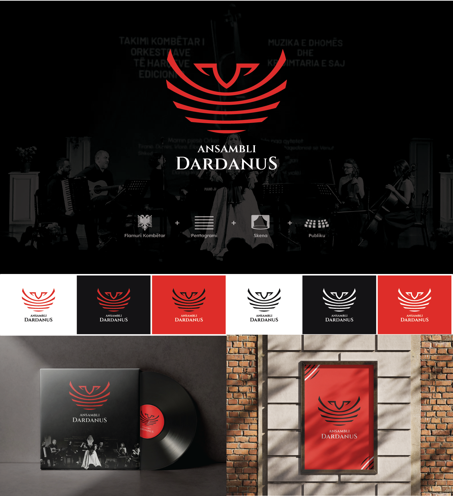 The logo design takes a minimalistic approach, synthesizing multiple symbolic elements central to the ensemble’s identity. At its core, the form references the Albanian double-headed eagle, abstracted to maintain visual clarity and modernity. The structure is built around the pentagram—the five lines of a musical staff—directly connecting the mark to music and composition. Curved lines within the design simultaneously suggest audience seating and stage curtains, evoking the live performance experience and the relationship between musicians and their audience.